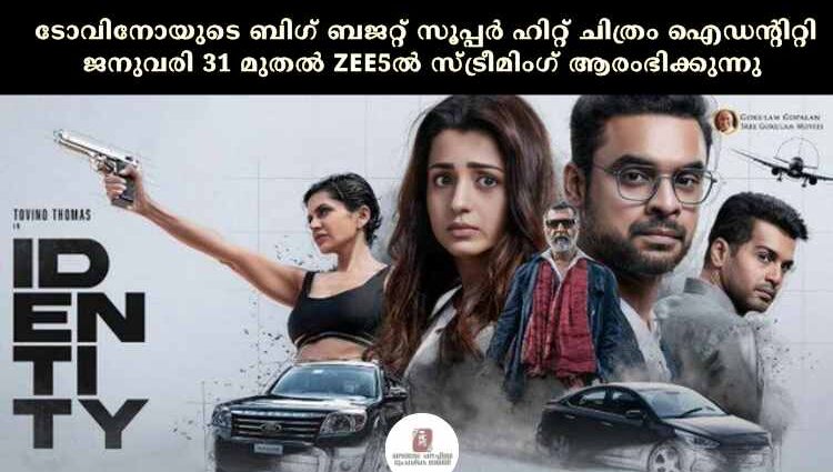 ടോവിനോ തോമസിനെ നായകനാക്കി അഖില് പോള് അനസ് ഖാൻ കൂട്ടുകെട്ടില് ഒരുങ്ങിയ ഈ വർഷത്തെ സൂപ്പർ ഹിറ്റ് ചലച്ചിത്രം ഐഡന്റിറ്റി ഡിജിറ്റല് സ്ട്രീമിങിന് ഒരുങ്ങുന്നു.ജനപ്രിയ ഒ ടി ടി പ്ലാറ്റ്ഫോമായ ZEE5 വഴി ജനുവരി 31 മുതല് ലോകമെമ്ബാടുമുള്ള പ്രേക്ഷകരുടെ കൈത്തുമ്ബില് ചിത്രം എത്തും.ബിഗ് ബജറ്റില് തിയേറ്ററുകളില് പ്രകമ്ബനം കൊള്ളിച്ച ചിത്രത്തില് തെന്നിന്ത്യയിലെ പ്രമുഖ താരങ്ങളായ തൃഷ,വിനയ്റോയ്,മന്ദിര ബേബി,അജു വർഗീസ് എന്നിവരും അണിനിരക്കുന്നുണ്ട്.